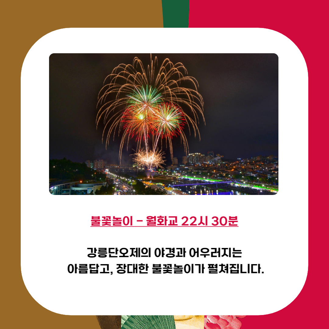 강릉단오제의 밤을 화려하게 장식하는 단오제의 하이라이트 불꽃놀이를 만나 볼 수 있다고 합니다.
