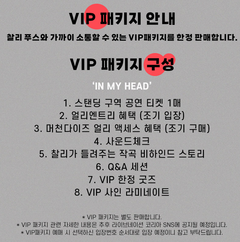 ※ VIP 패키지 추가시 티켓 오픈일 전 관련 내용이 상세페이지에 업데이트 될 예정이오니 참고 부탁드립니다.