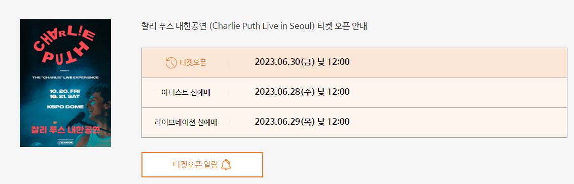 최근 브루노 마스 슈퍼 콘서트가 화제였는데요. 2023년 내한 공연 예정 가수들이 꽤 많습니다. 그 중에서도 오늘은 싱어송라이터 찰리푸스 내한 콘서트 일정에 대해 알아보려고 합니다. 콘서트 일정과, 공연장소, 좌석별 티켓 가격, 예매일정까지 모두 알아보도록하겠습니다.
