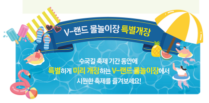 수국길 축제기간 동안에는 특별하게 미리 개장하는 V랜드 물놀이장에서 시원한 축제를 즐길 수 있습니다. 물놀이장에서는 신나는 물총싸움을 즐길 수 있어 아이들에게 인기가 많을 것 같습니다.
