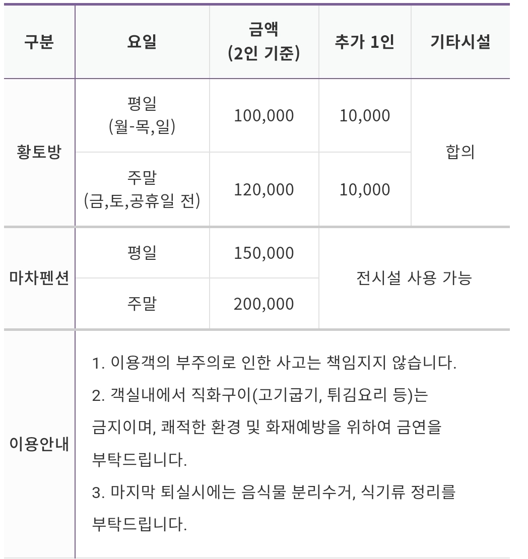 성수기에는 주말 요금이 적용된다고 하니 문의시010-7272-1555 로 문의하시기 바랍니다.