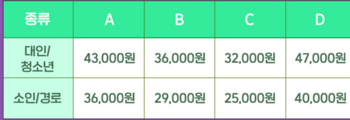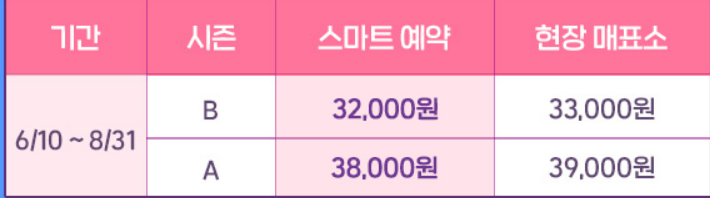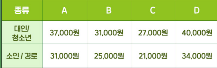 일반 (25세 ~ 64세) 7,000원 / 청소년 (7세 ~ 24세) 3,500원 / 시니어(65세 이상) 3,500원