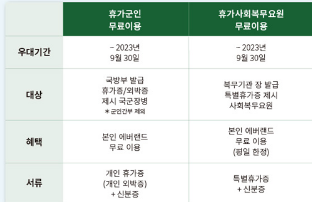 군인 간부 (장교 및 부사관), 군무원, 사관생도, 간부호보생 본인 + 동반 1인까지 50%우대 가능합니다.