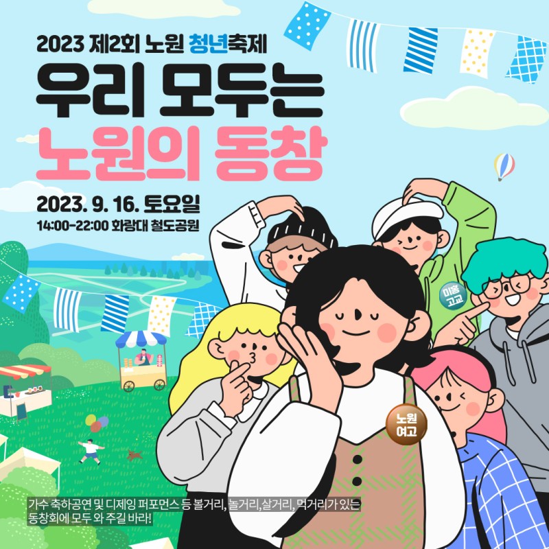 가을이 한창인 9월의 중순입니다. 오늘은 선선한 가을에 가기 좋은 축제를 하나 소개해드릴까 합니다. 2023 청년의 날을 맞아 청년 세대가 직접 기획하고 참여하는 제2회 노원 청년축제 <우리 모두는 노원의 동창> 행사를 화랑대 철도공원에서 개최합니다.