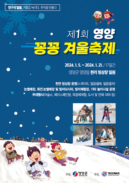 안녕하세요. 제쪼입니다. 1월에는 겨울을 맞이한 여러 겨울축제가 개최 중입니다. 오늘 소개할 축제는 영양꽁꽁겨울축제로 제1회 영양꽁꽁겨울축제는 영양군 영양읍 현리 670번지 일원에서 개최되는 겨울축제로서 20년 전통의 영양무료빙상장을 확대개편하여 개최되는 최초의 영양군 겨울축제입니다.