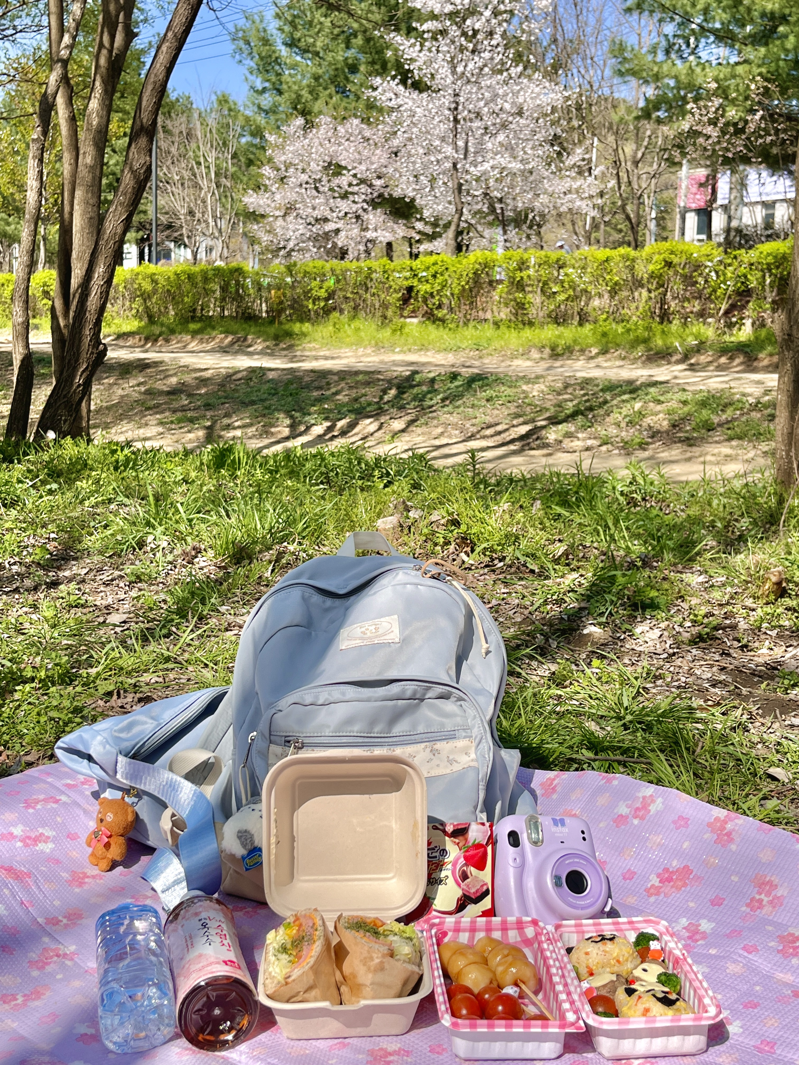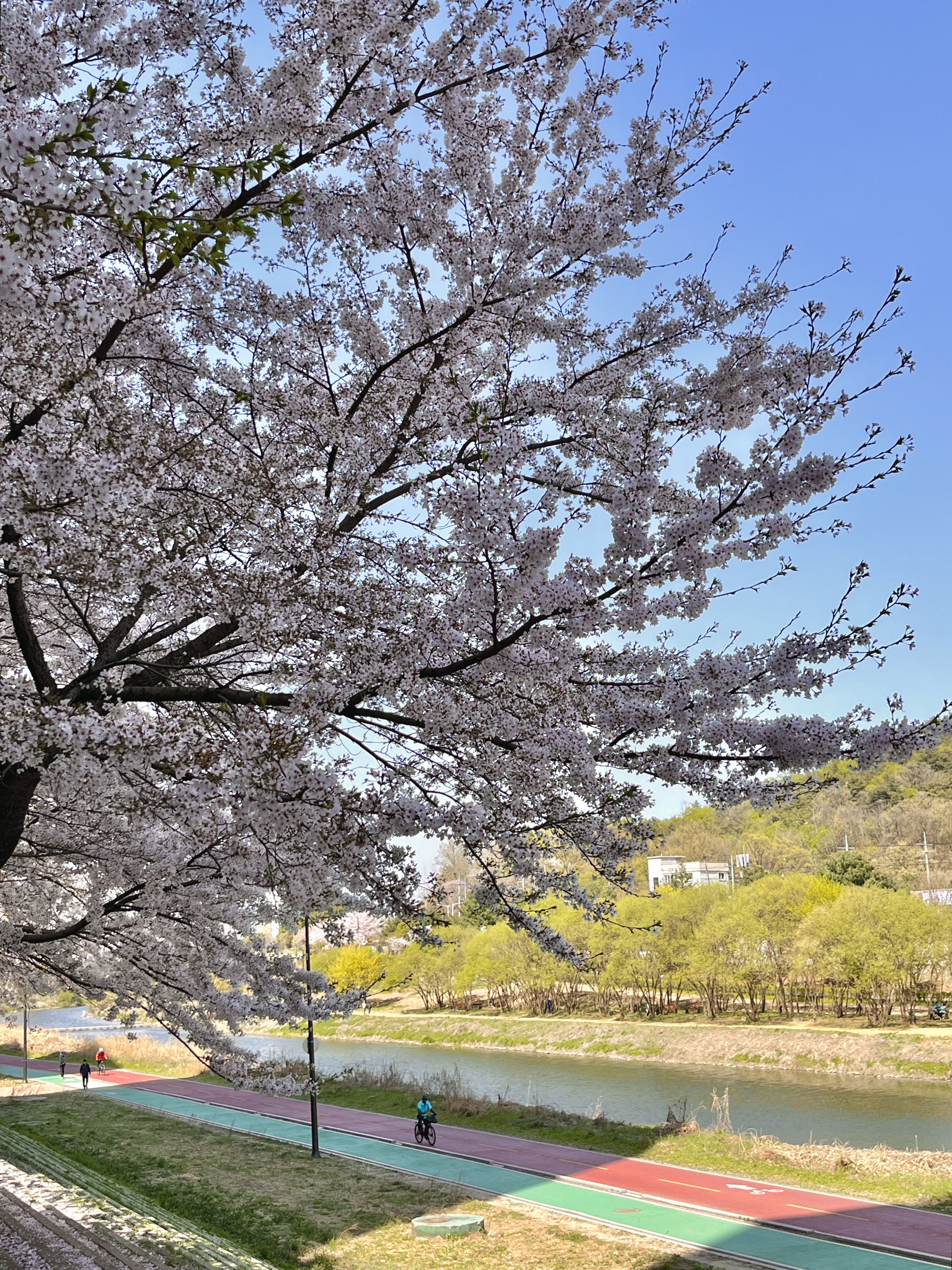 벚꽃길과는 멀지만 작은 벚꽃나무들이 있는 산책길 사이의 나무 근처에서 피크닉을 즐겼습니다. 반대방향으로 바라보면 중랑천을 넘어 아까 걸어왔던 호원벚꽃길이 끝없이 펼쳐져있었습니다.