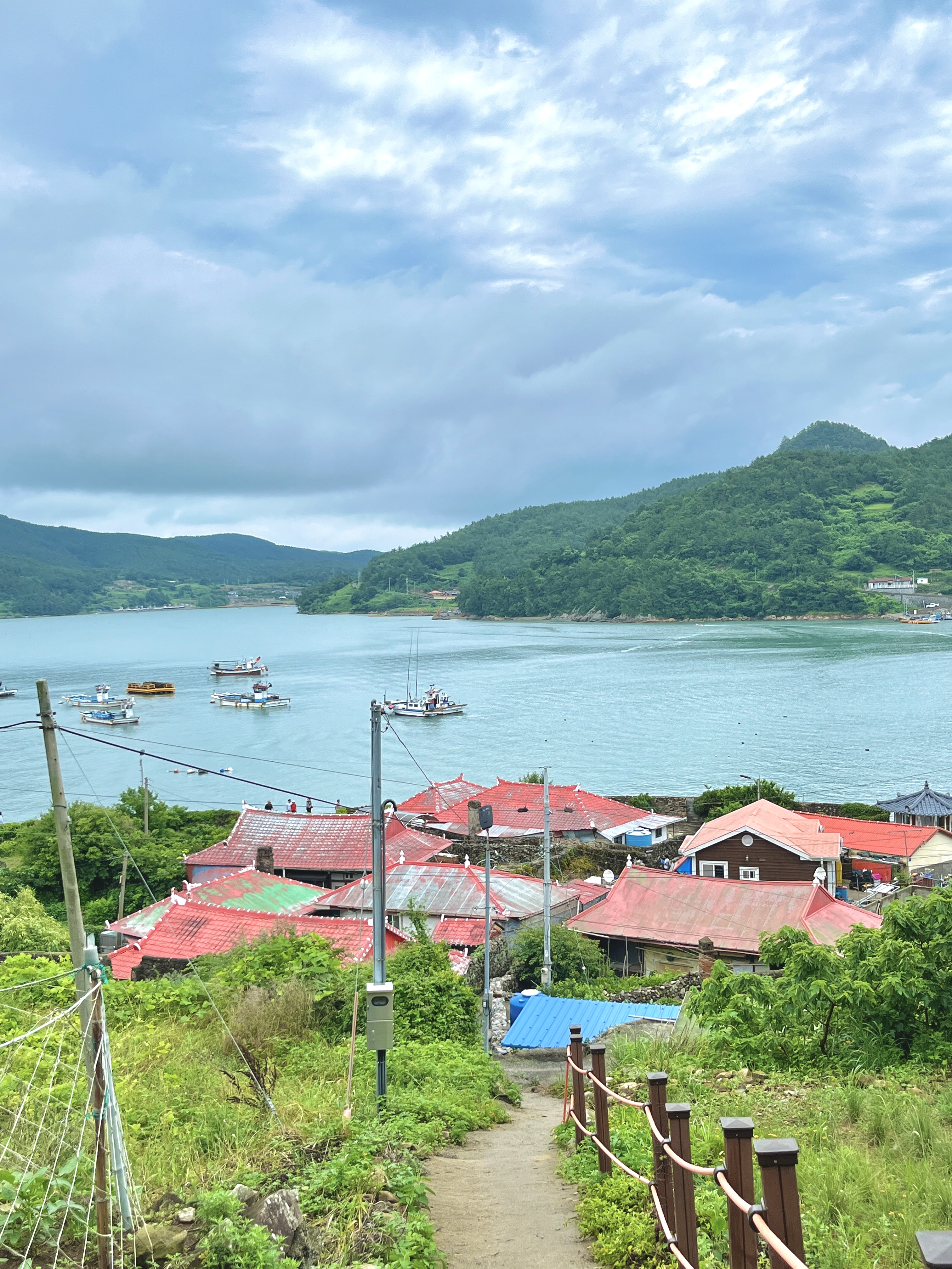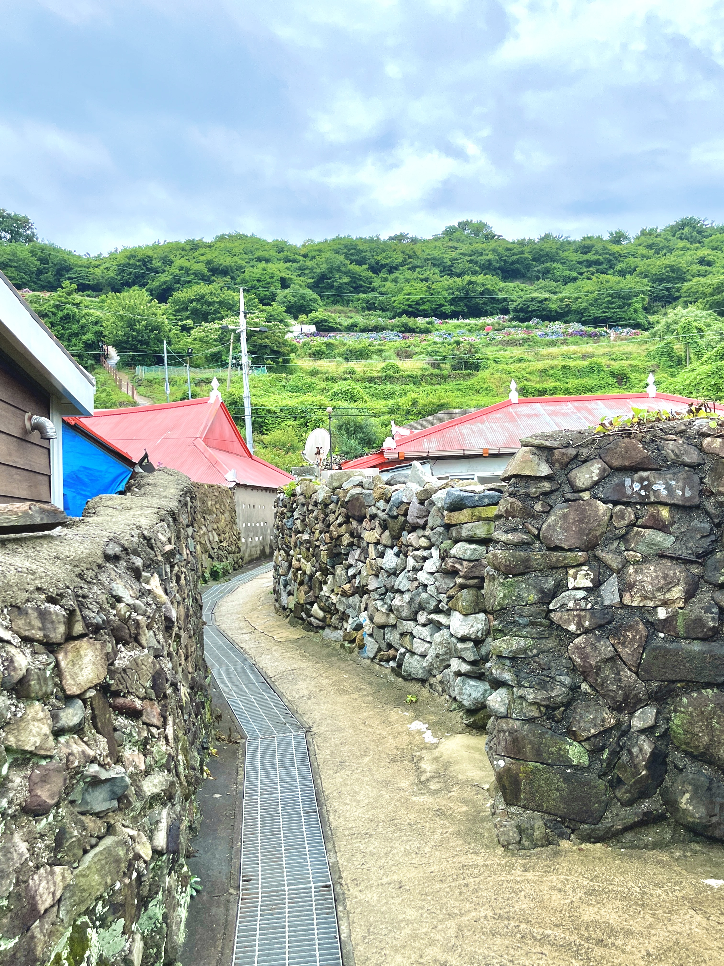 수국 정원으로 바로 향하는 길은 주황색 지붕이 있는 마을 안쪽까지 들어와 돌담길을 따라 수국이 어렴풋이 보이는 곳으로 쭉 올라가면 됩니다. 이쪽도 탐방로보단 낫지만 꽤나 가파르기 때문에 걸을 때 조심하셔야 합니다.