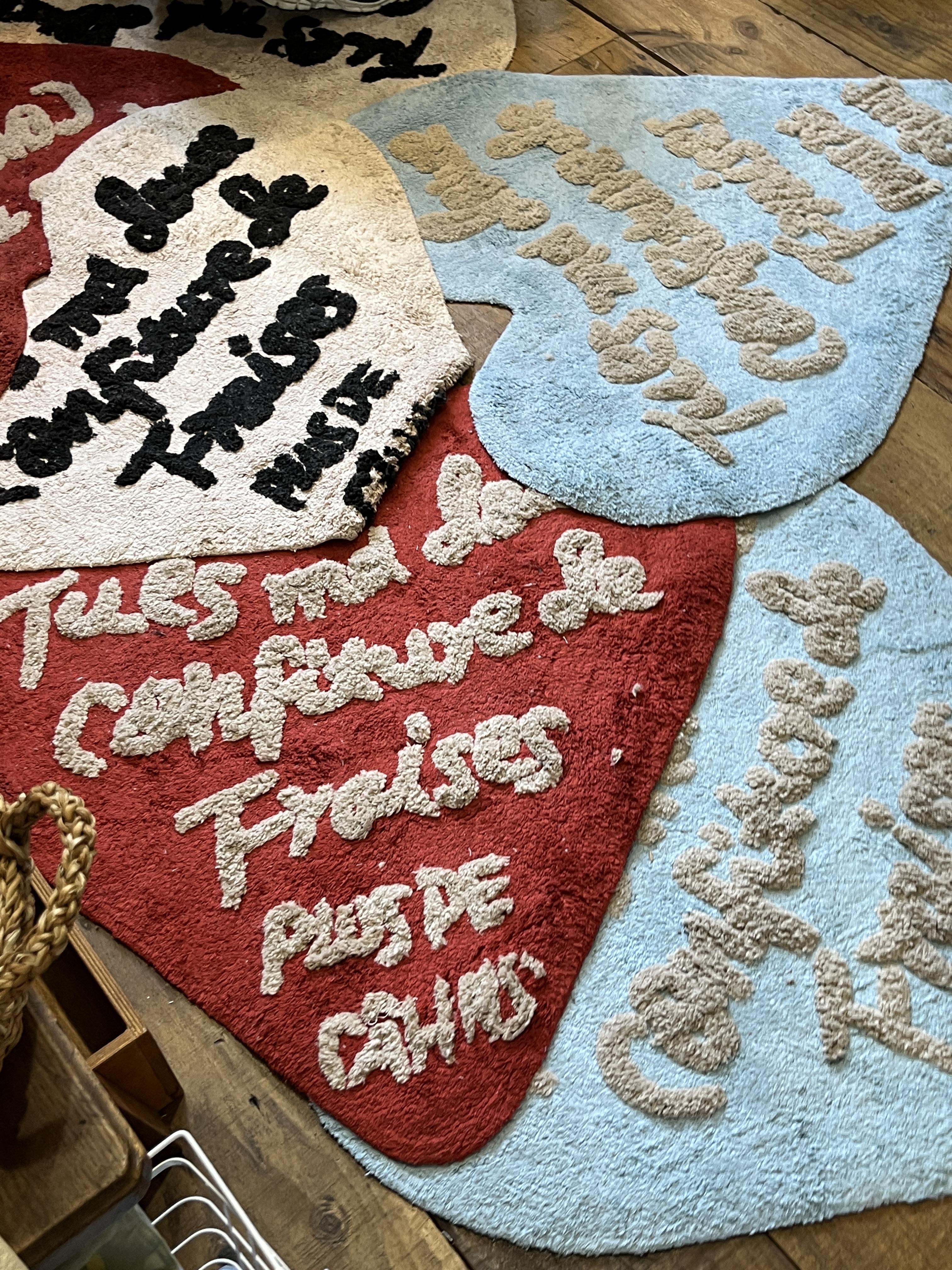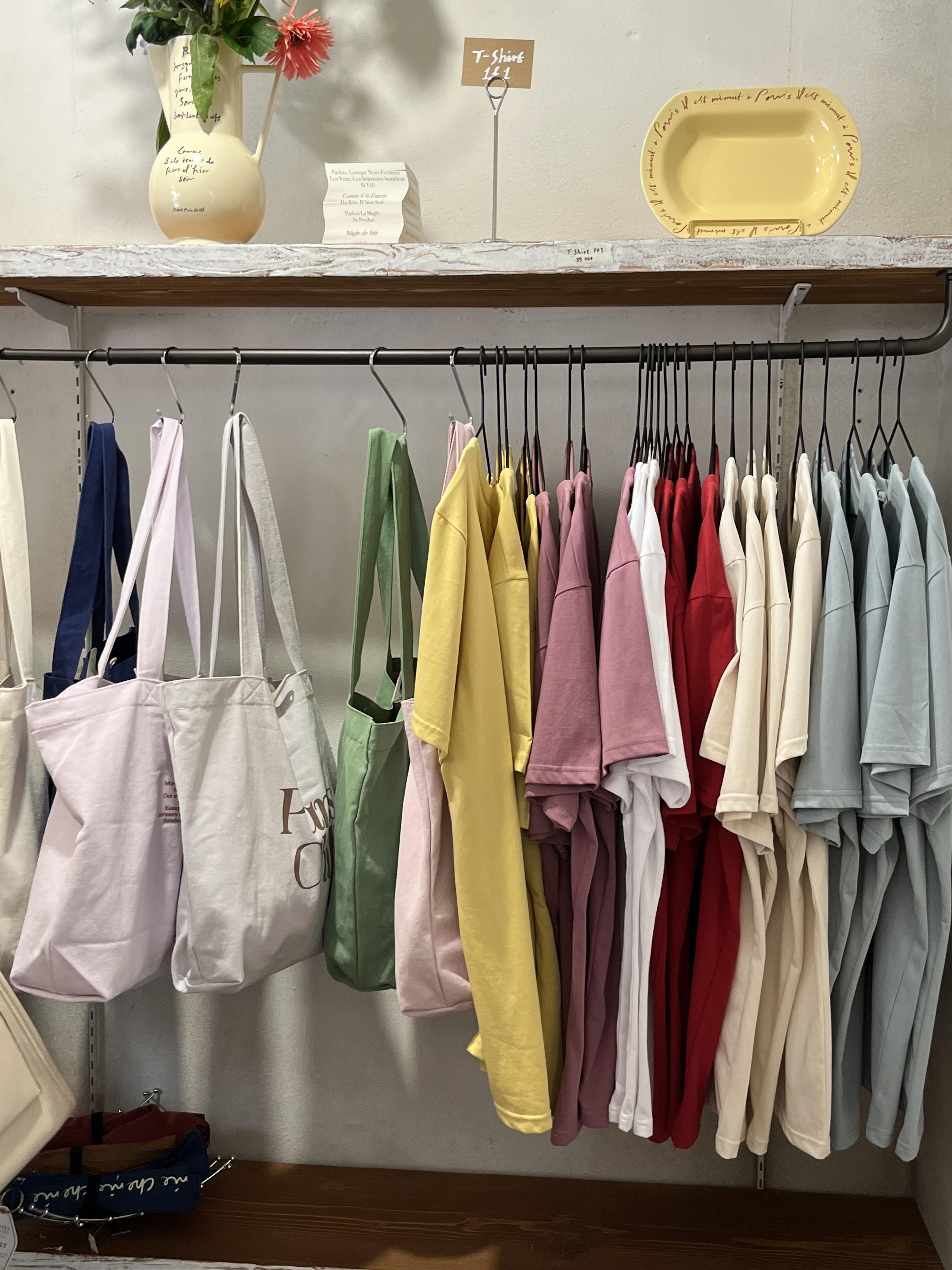세 번째 공간에는 티셔츠, 에코백, 파우치, 모자 등 패브릭 제품들이 있었습니다.