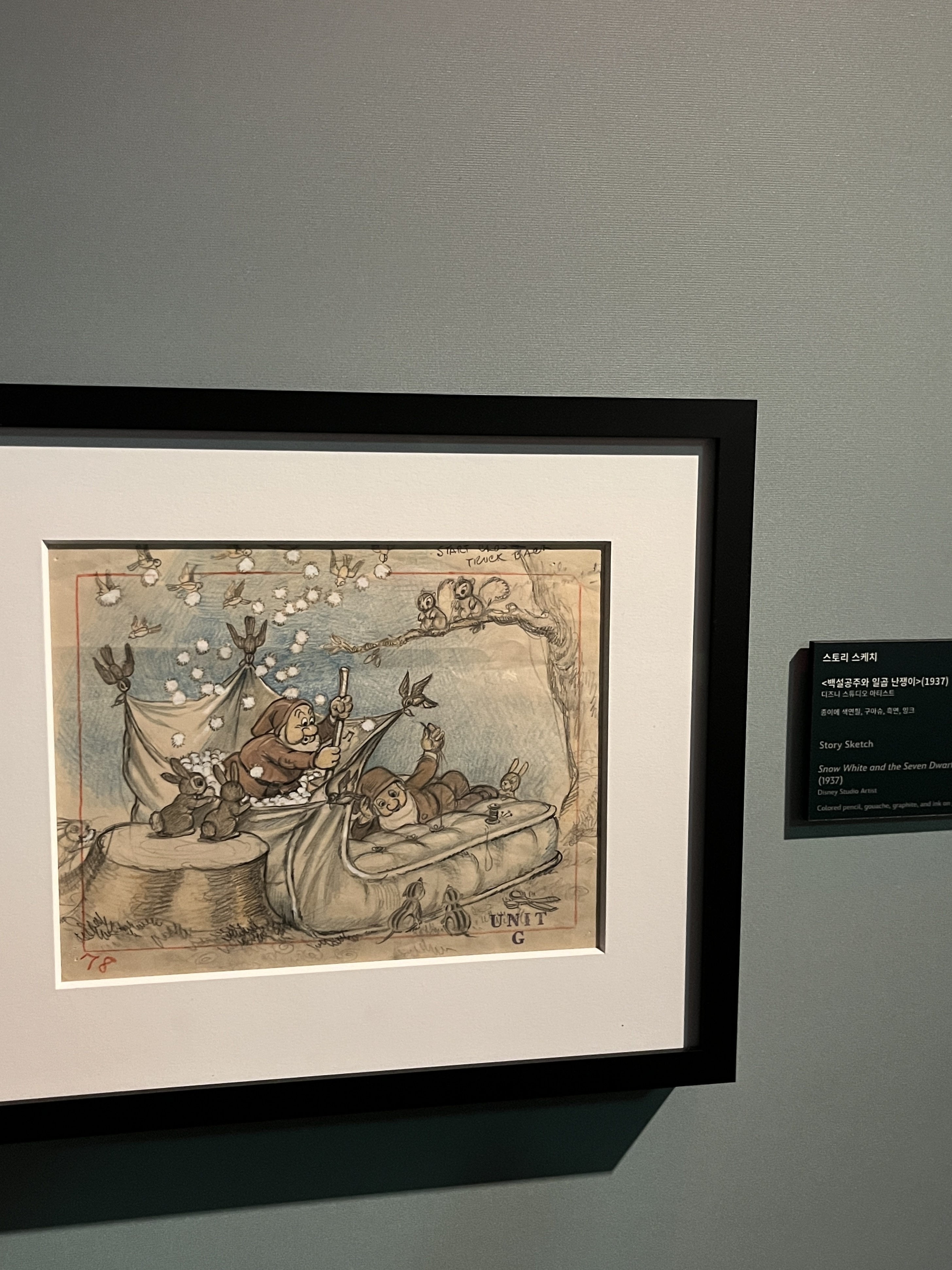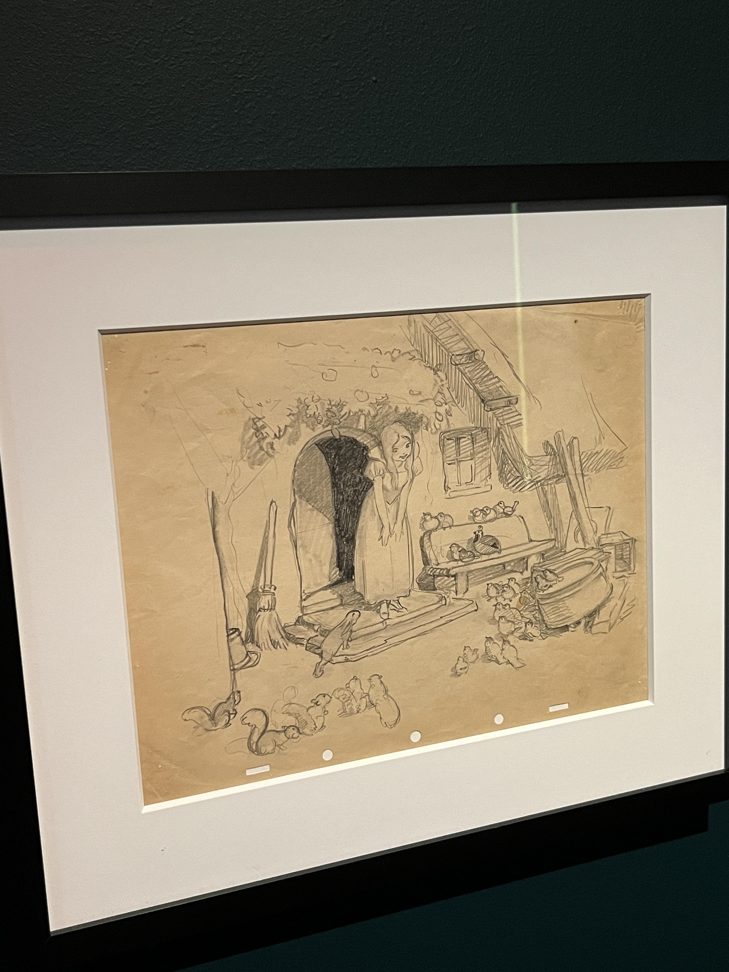 백설공주와 일곱 난쟁이의 스케치입니다. 지금 알고 있는 백설공주의 모습과 다른 긴 머리의 백설공주를 볼 수 있네요.