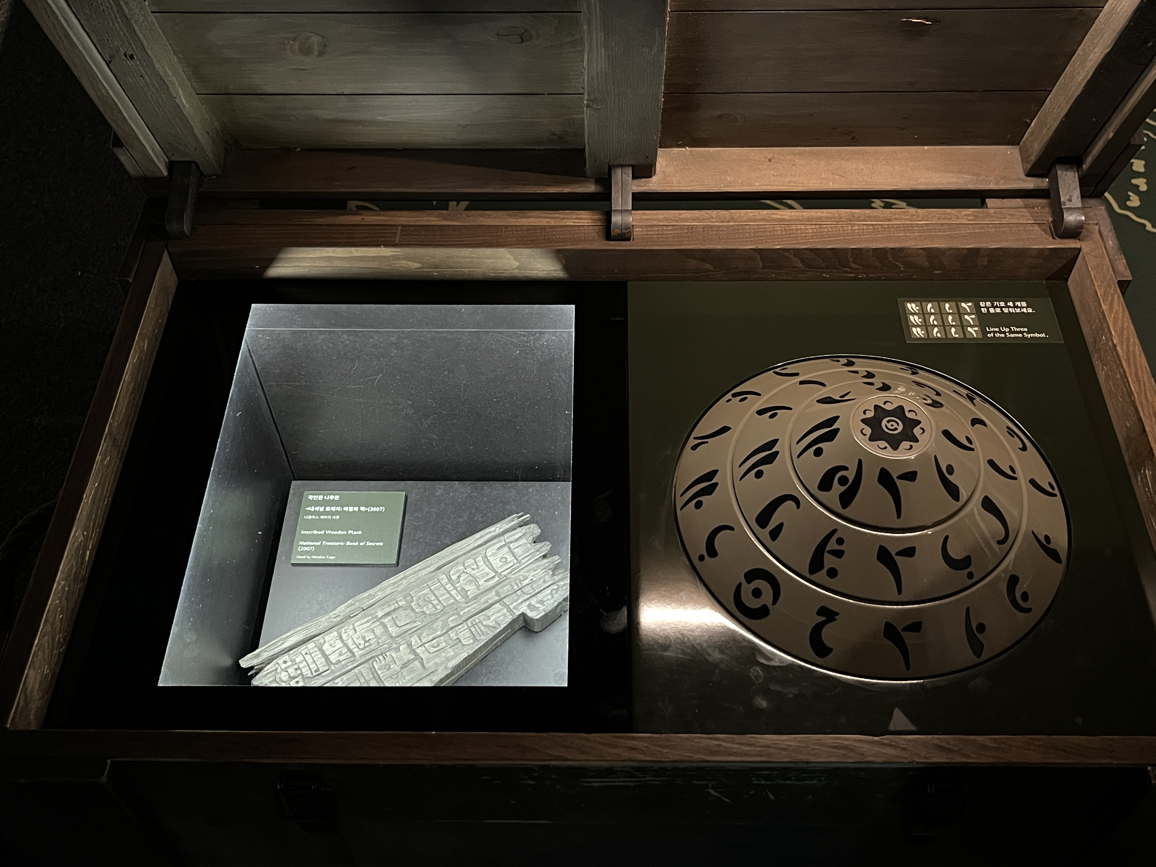 세 가지 모양을 맞추면 각인된 나무판이 등장합니다. 영화에 나온 소품 같습니다.