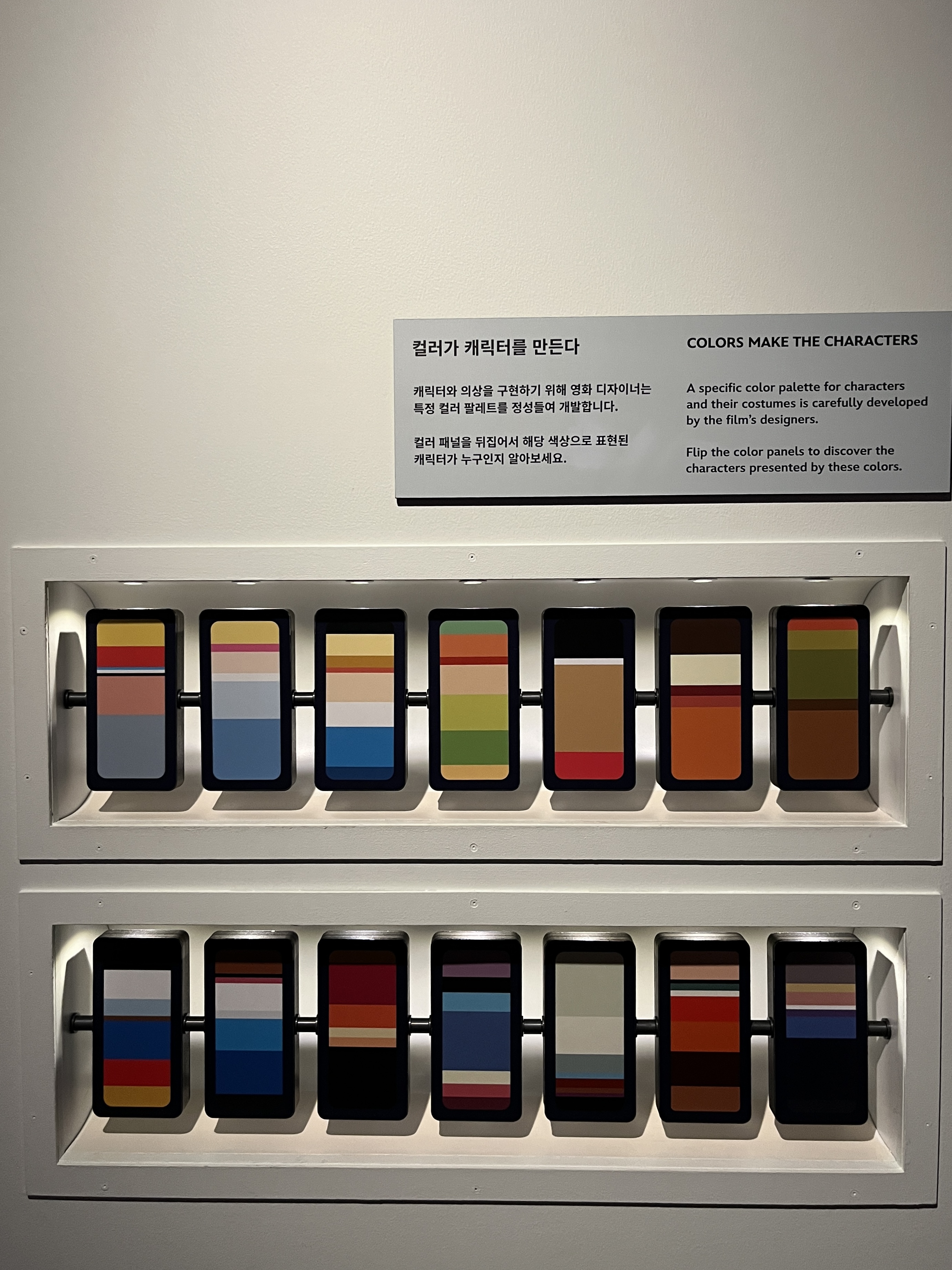 중간중간 직접 만지고 듣고 체험해 볼 수 있는 전시들도 있습니다. 컬러패널의 색상을 보고 어떤 캐릭터인지 알아맞히는 전시입니다. 뒤집으면 캐릭터가 나와요.